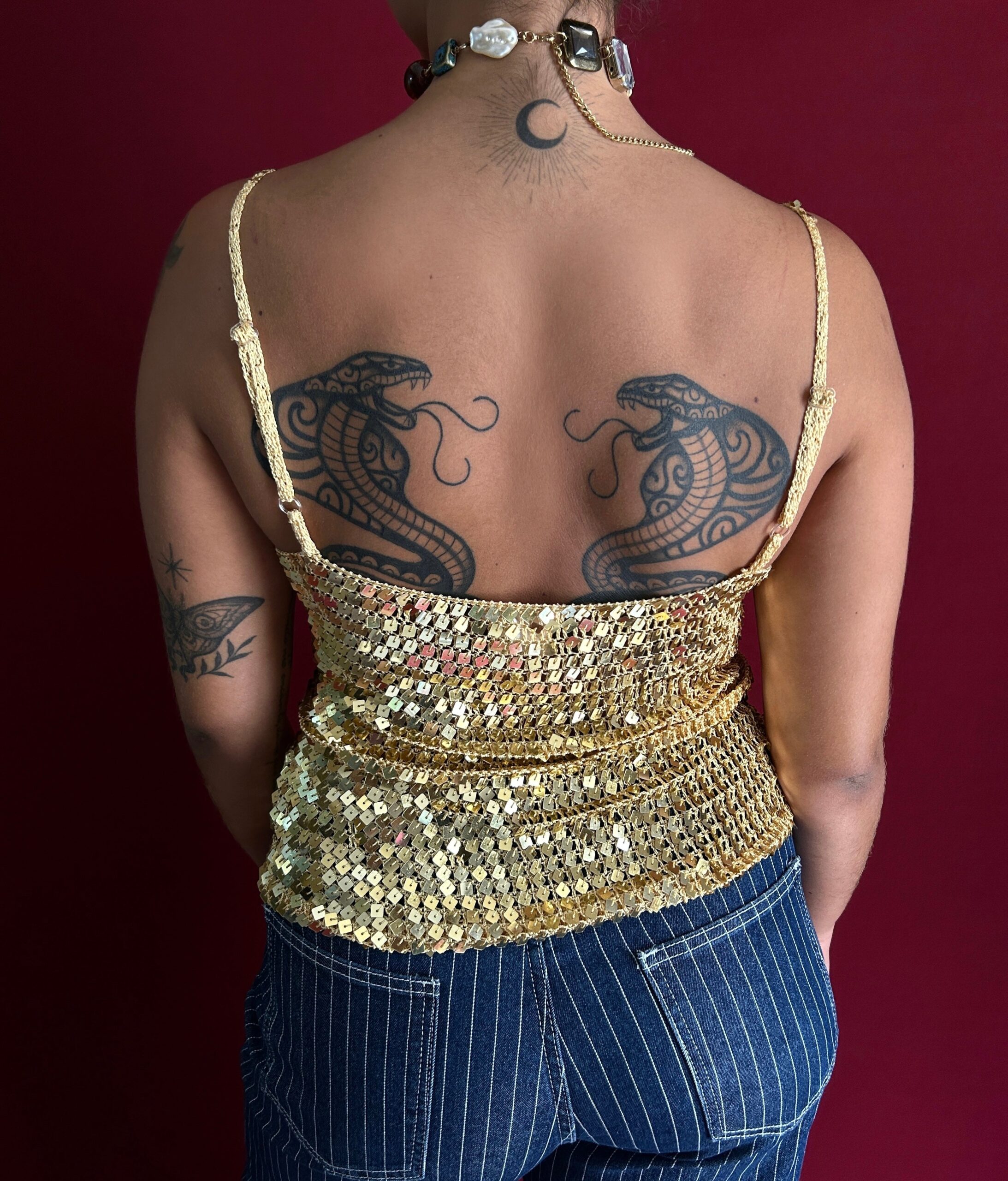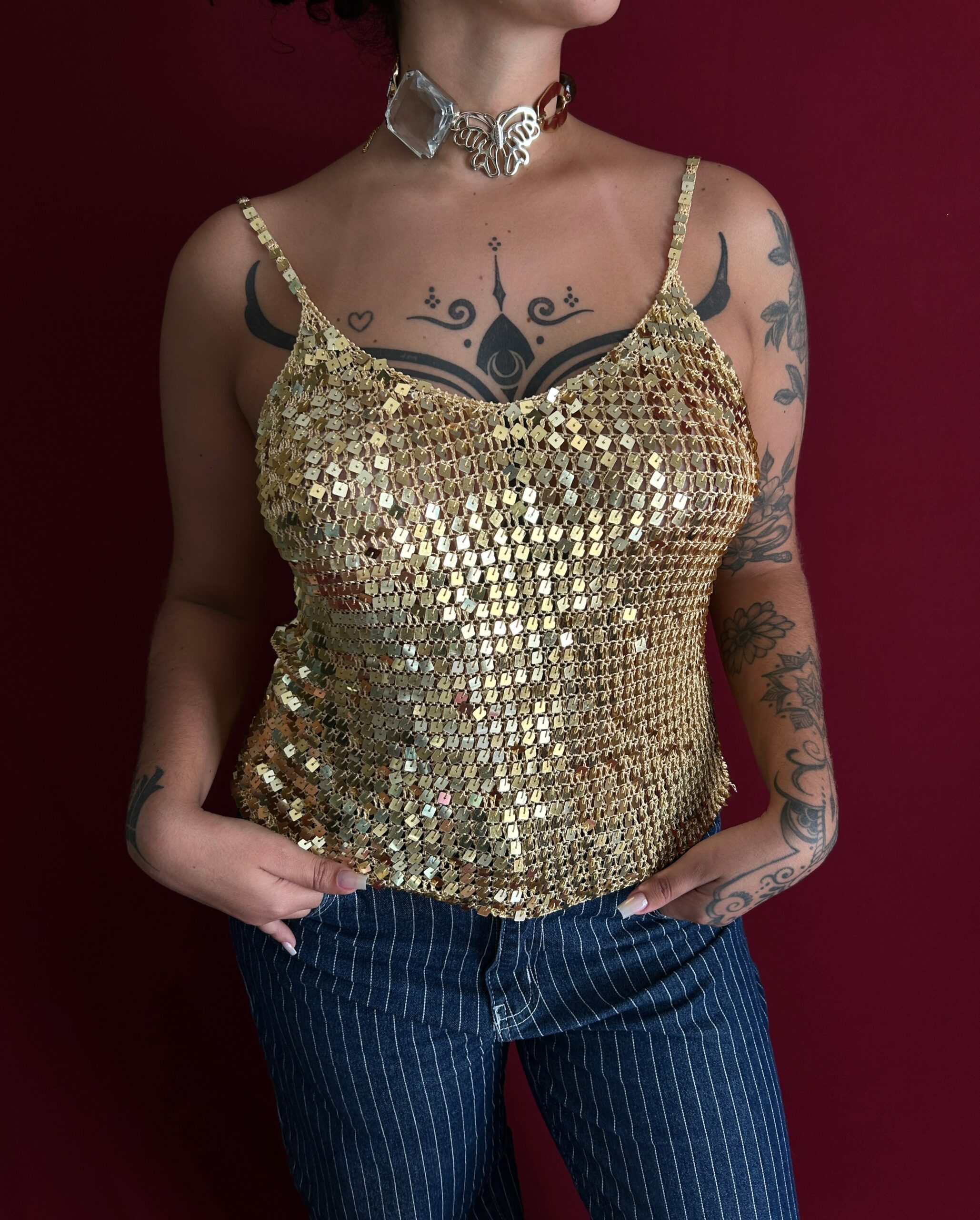 Blusa de tricot com paetês dourados. Possui regulagem na alça. Está em ótimo estado.