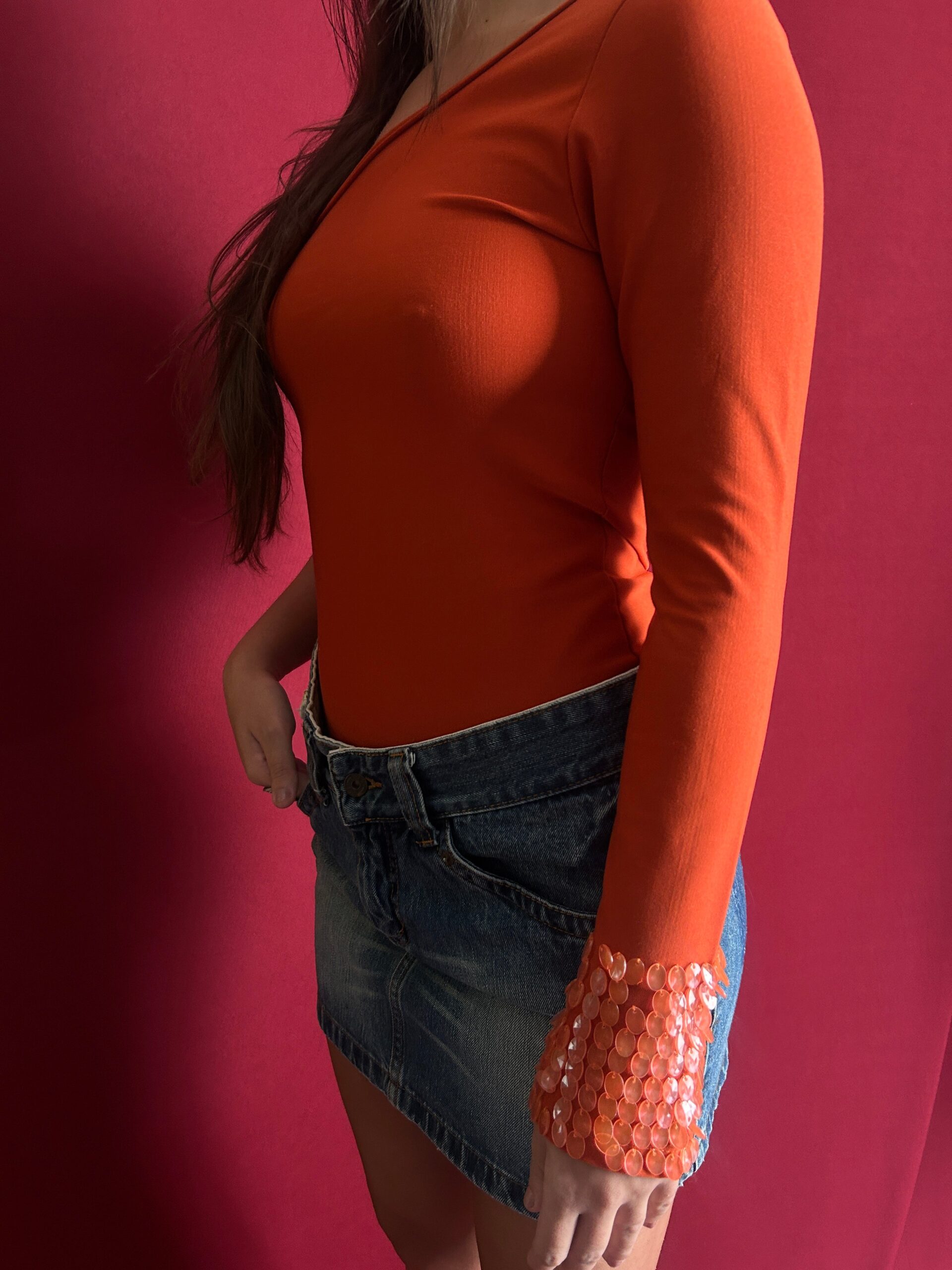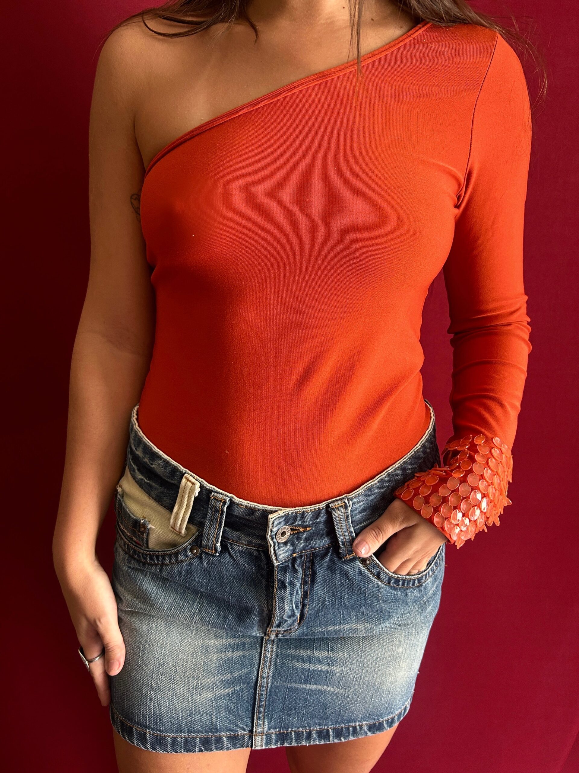 Blusa terracota de um ombro só, com manga longa e miçangas no punho. Tamanho único na etiqueta, mas veste melhor M. Algumas miçangas estão faltando, mas é praticamente imperceptível. Fora isso, está em ótimo estado.