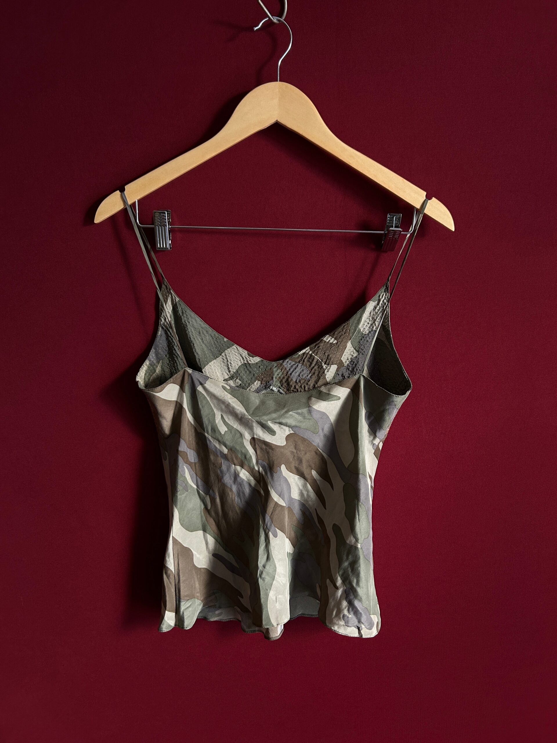 Blusinha Animale 100% seda, com estampa camuflada e paetês no busto. Possui alcinhas bem finas e não têm regulagem. Está em perfeito estado.