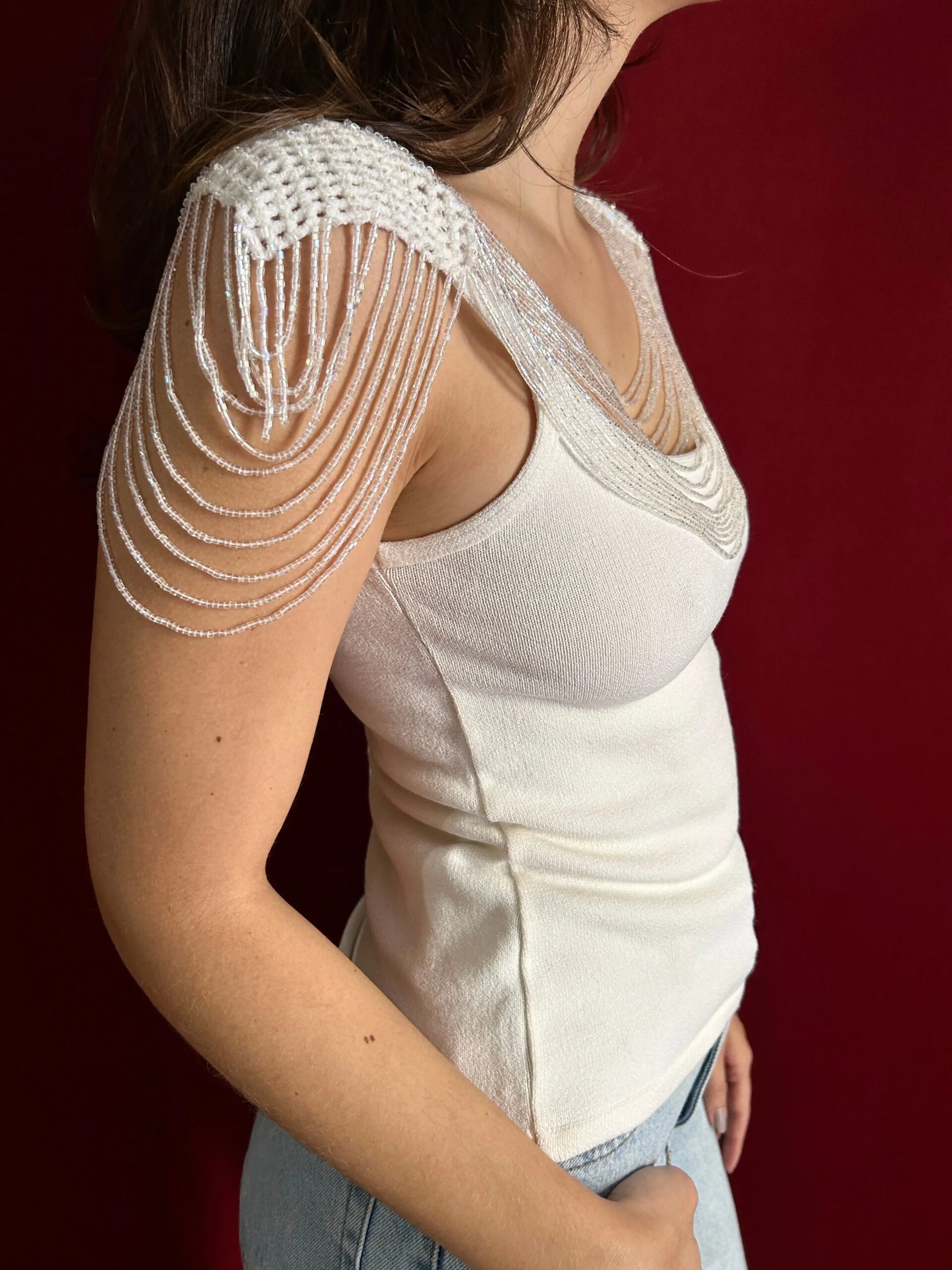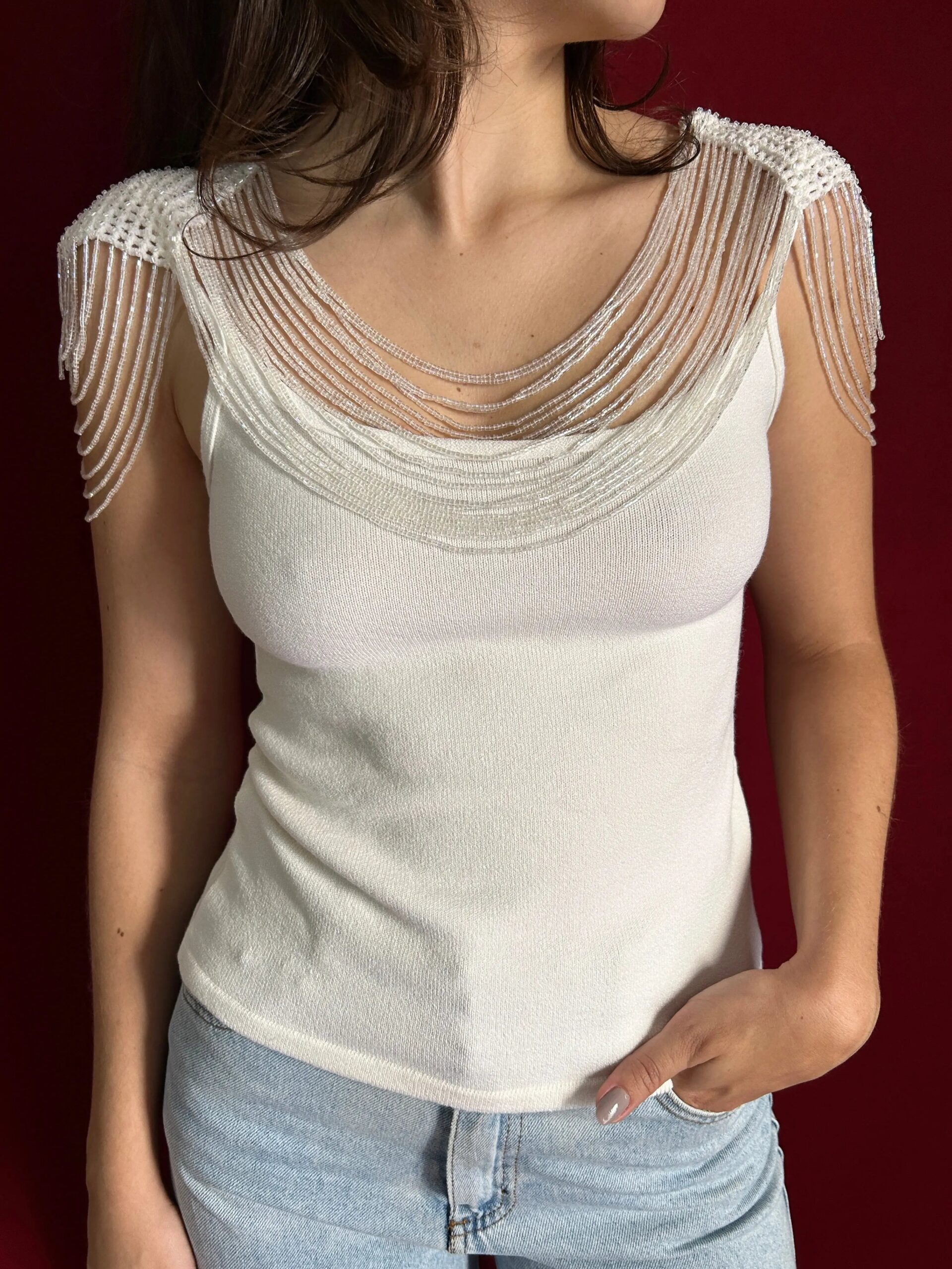 Blusinha branca em malha tipo tricot, com detalhes nos ombros e no busto em canutilhos. Tamanho M na etiqueta, mas veste melhor P. Está em perfeito estado.
