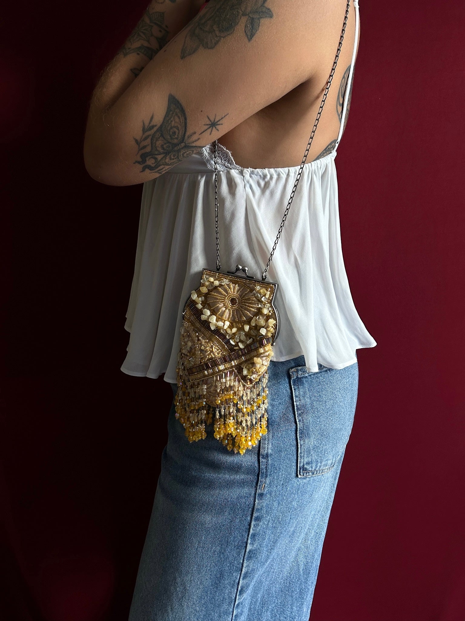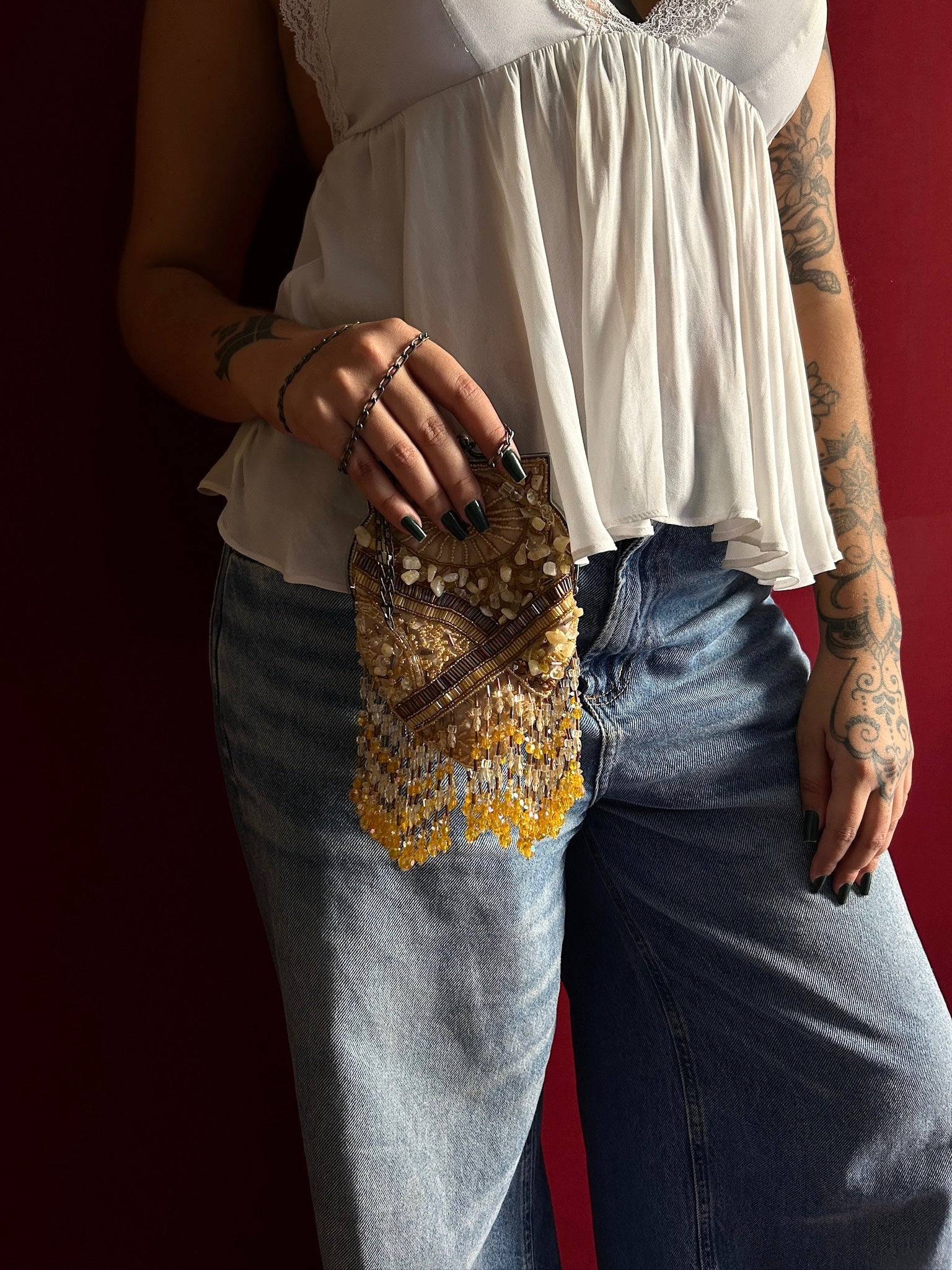 Bolsinha vintage toda bordada em pedrarias e miçangas. Pode ser usada no ombro, ou na mão. Está perfeita.