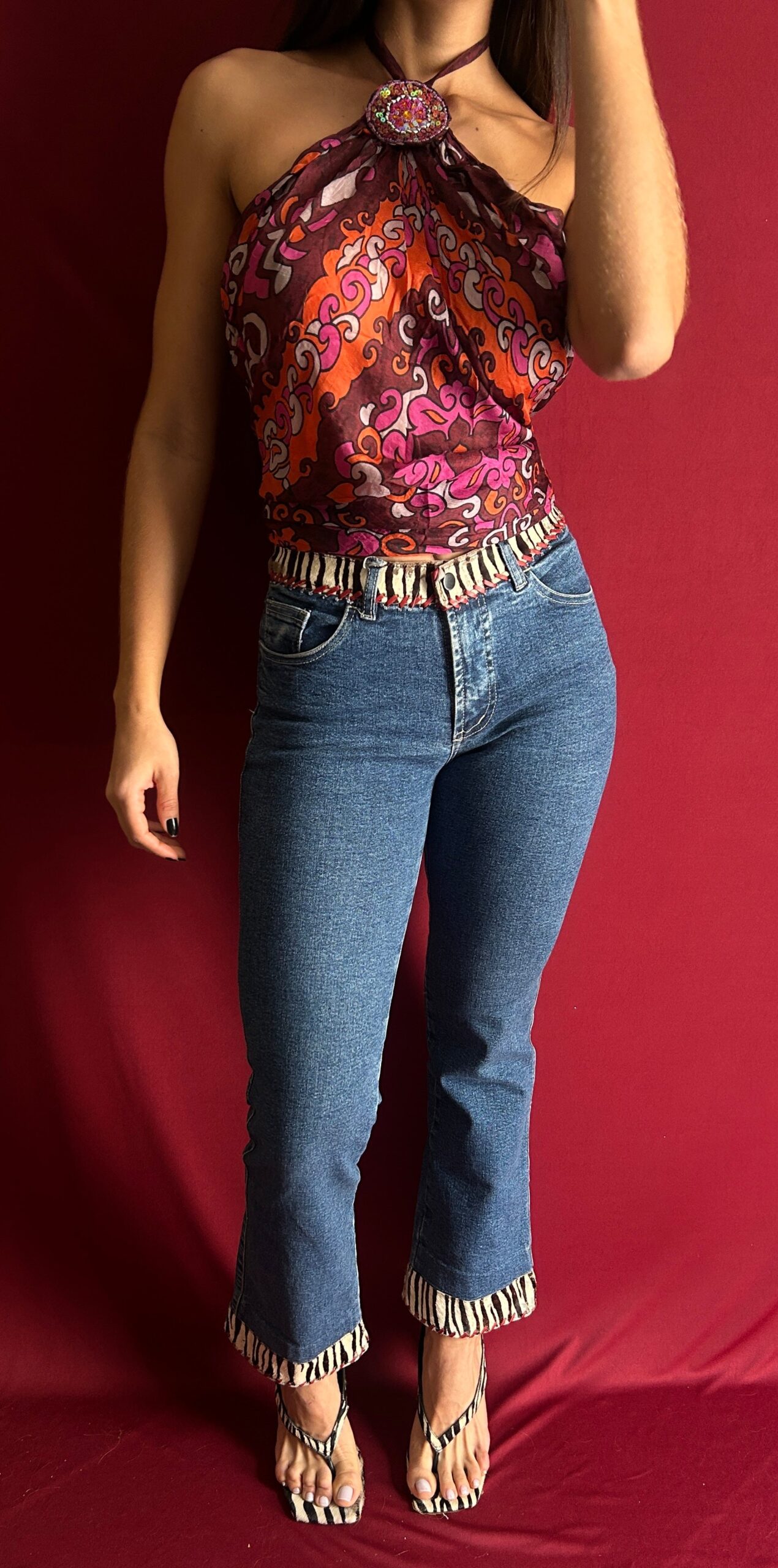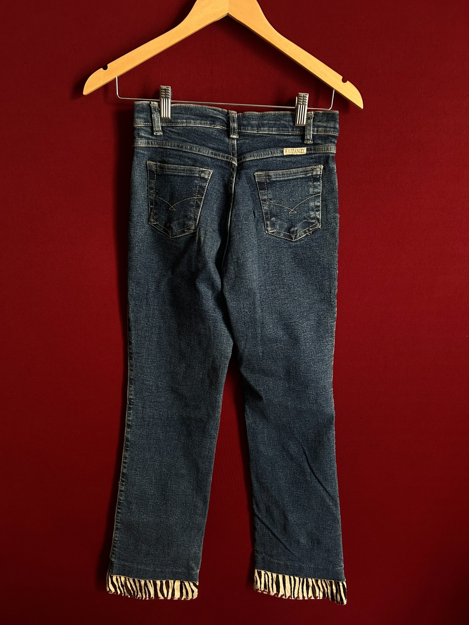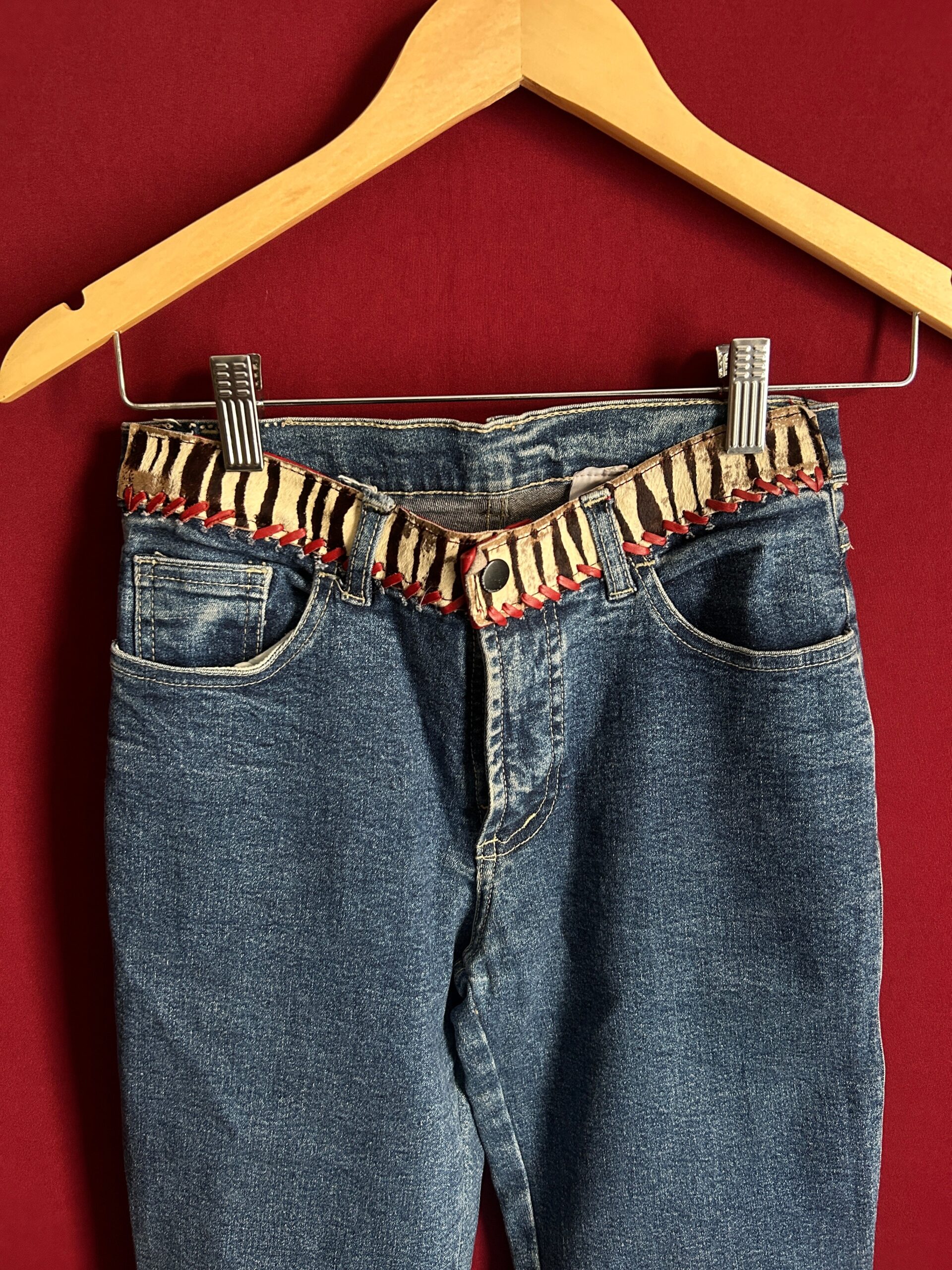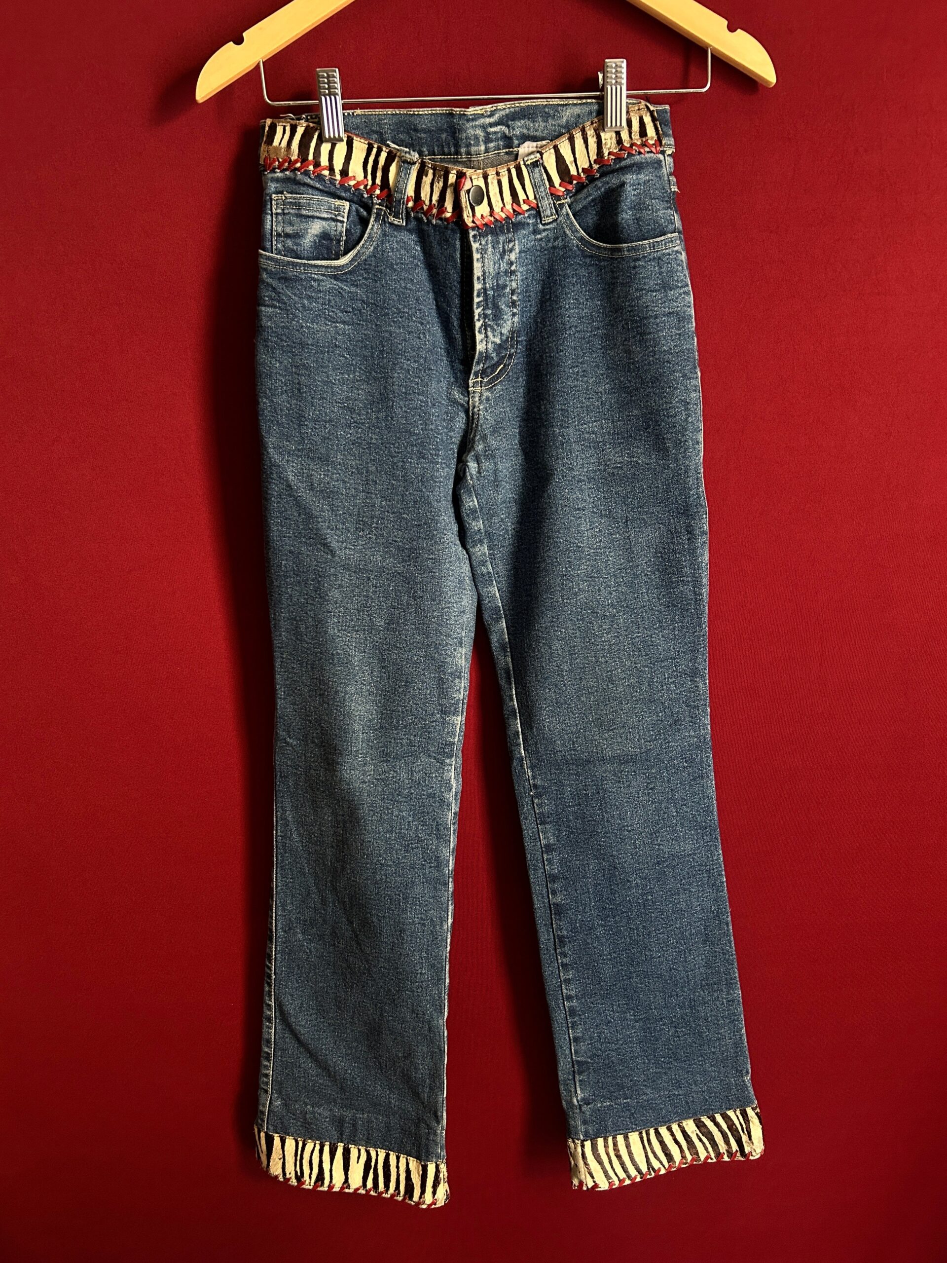 Calça jeans azul com detalhe em couro na cintura e na barra. Tamanho 40 na etiqueta, mas a modelagem é bem pequena, serve um 34. O couro tem pequenos desgastes em algumas partes, mas parece até que é detalhe da peça. Fora isso, está em excelente estado.