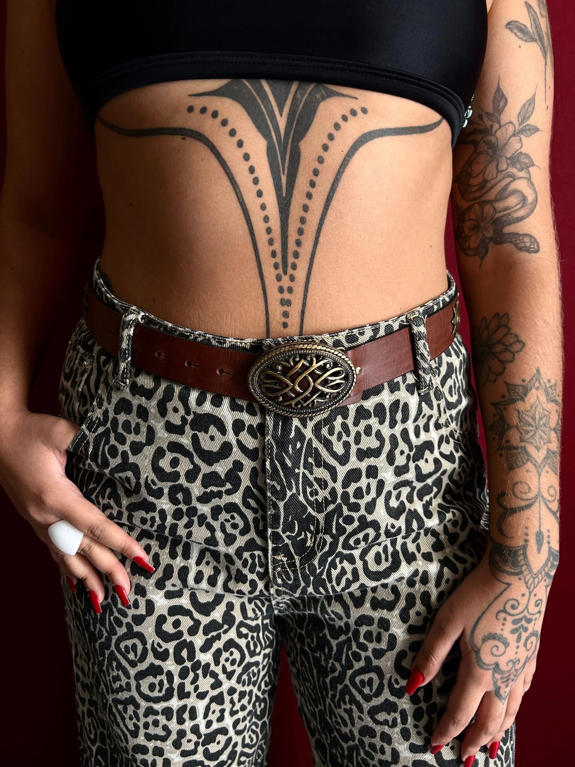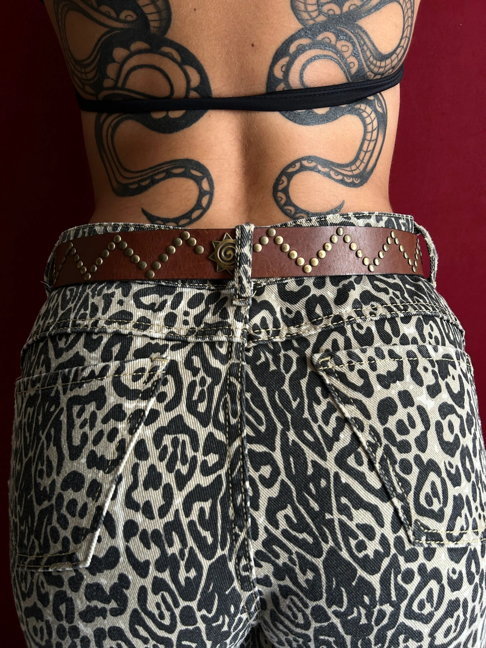 Cinto boho de couro legítimo, com rebites, e fivela oval vazada. Está em excelente estado!