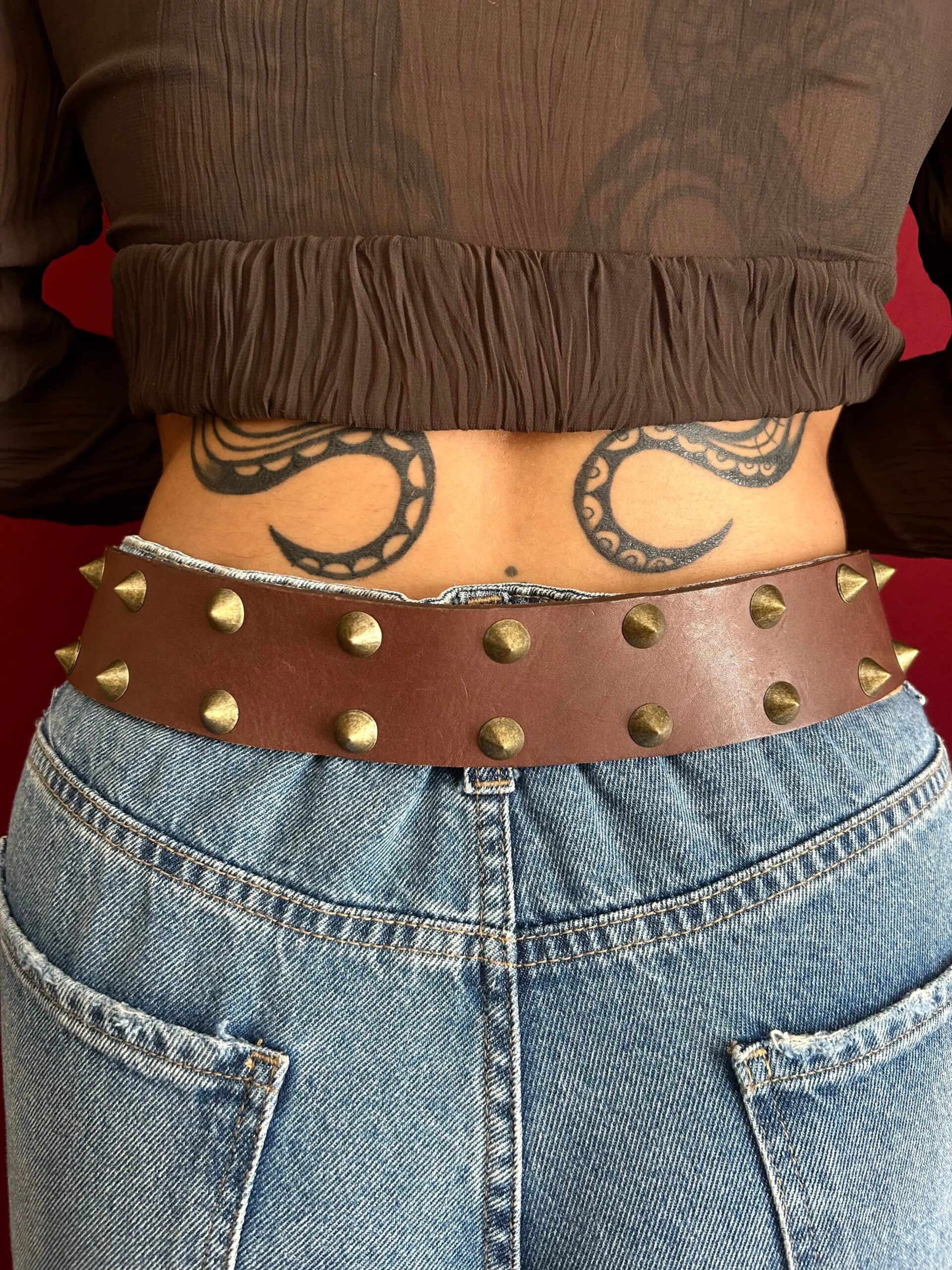Cinto marrom de couro legítimo com spikes e fivela retangular. Em ótimas condições.