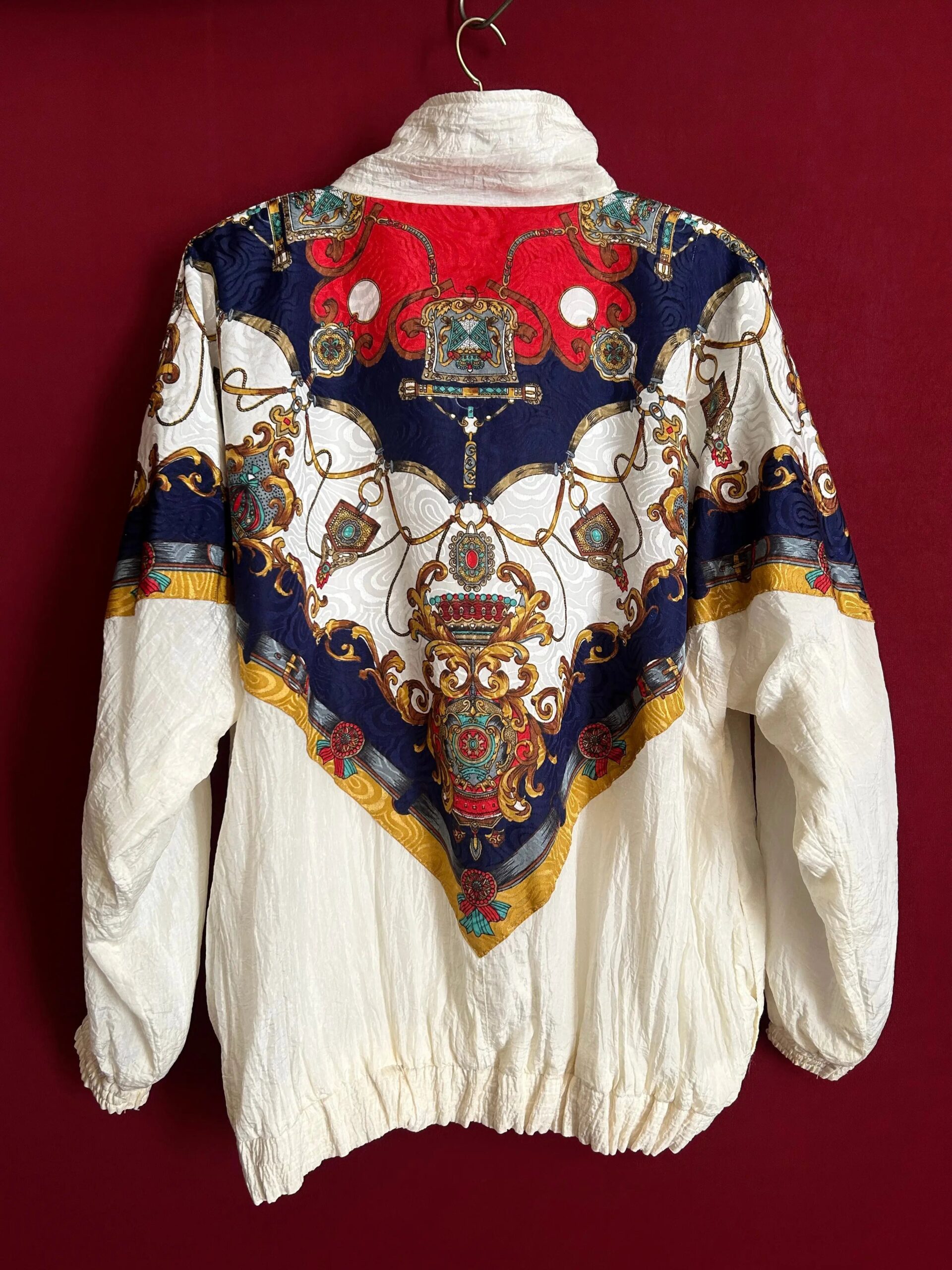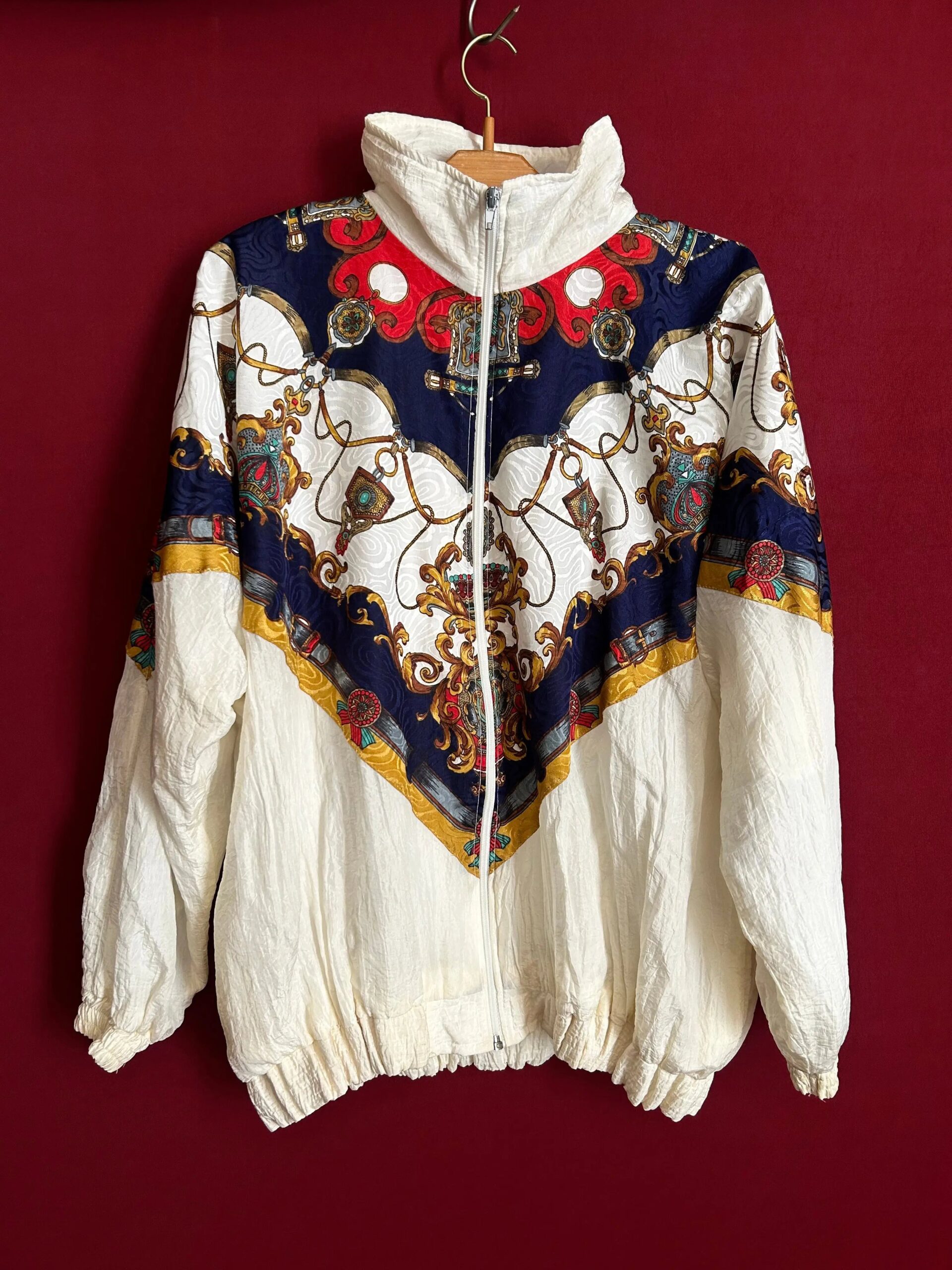 Jaqueta off white vintage, forrada, com bolsos e estampa de lenço. Modelagem ampla, veste do P ao G. Está em excelente estado.
